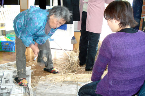 近所の公民館で地域の人たちに教えてもらいながら、縄ないをするが、簡単には縄にならない。こういう技術って、やっぱり言葉では伝えられないもので、その場で、体を使いながら手が覚えるしかない。縄ができても、三本の縄をより合わせていくのは一人では大変で、一緒に行った