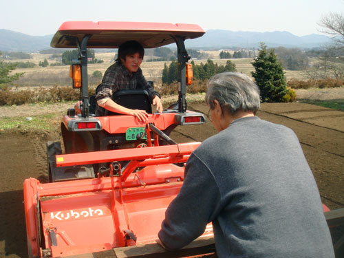 春のある日、その畑にトラクターがやってくることになった。土を耕すのだが、いよいよ今年の農作業が始まると、朝からみんなワクワクしていた。昼過ぎ、戸来ケアマネージャーが運転するトラクターがダッダ・・・・と大きな音をたて畑に入ってくる。すると待ってましたとばかりにデイサービスとグループの人たちがいっせいにテラスに集まった。
