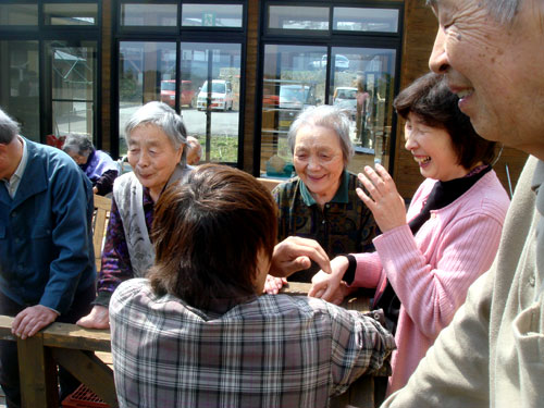 農作業の親方、デイの利用者の良夫さん(仮名)に戸来さんが声をかけ「次はうね作らねばね。よろしく」と二人が握手する。それを見て、みんなもすっかりその気になる。「さあ〜何を植えようか」と話がはずむ。 |