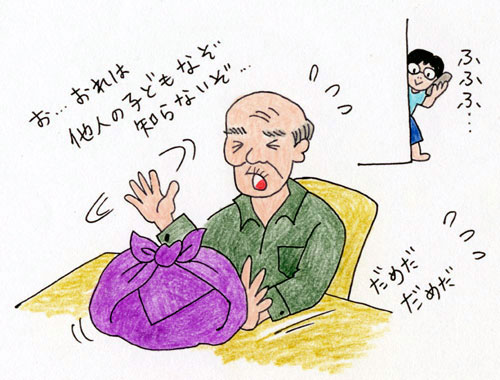 二人はすっかり会話が盛り上がり、だんだんに私も風呂敷も目に入らなくなってきた感じ。珍道中は一段落? 二人を残して私は、風呂敷を持ったままテーブルの昭さん(仮名)のところへ行ってみる。「どっこいしょ、あぁ、重かった」と風呂敷包みを下ろす。 「お嬢さん、それ、なんだ?」と、少し面食らったみたいにして昭さんが言う。 「へへ…、子供、おんぶしてた」と、ちょっとイタズラ心で私。 「お嬢さん、子っこ、出たってか?」