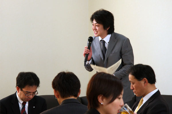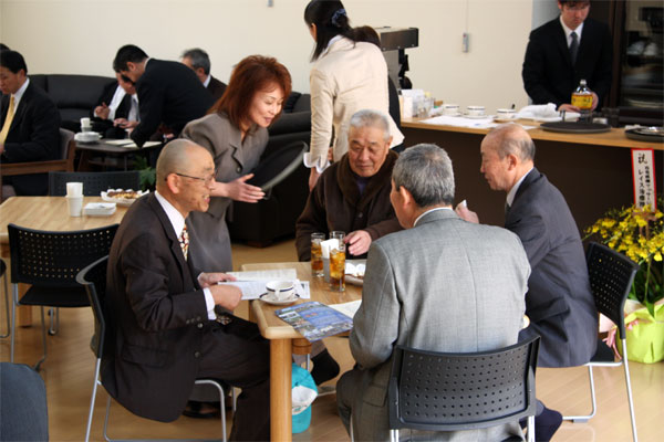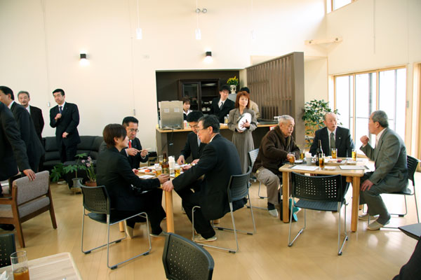 特養外観 「憩いの場」交流スペースにて 和やかな雰囲気での落成式 新スタッフ力作のオードブル 設計監理士様からの挨拶