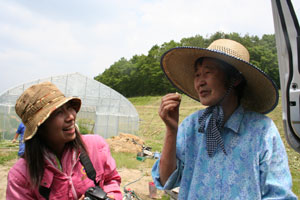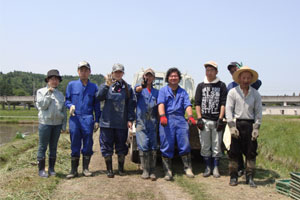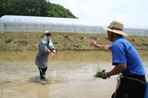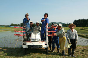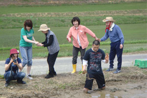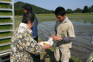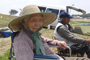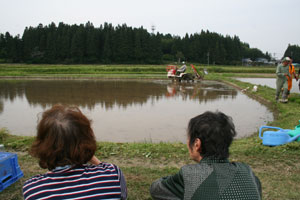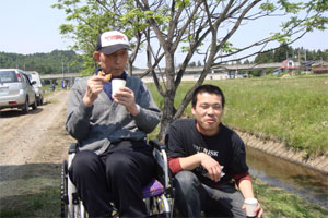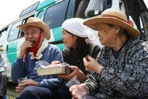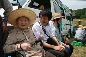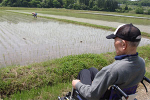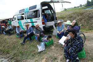 おやつタイムでは、新太さんとトシさん(仮)は車の外で、スギさん(仮)とサチさん(仮)は車の中で、それぞれ田植えの感じに浸りながらひと時を過ごした。田んぼをバックに、会話も弾み、それぞれの昔話を語ってくれた。普段、室内で過ごす様子とはまた違う新たな一面を垣間見ることができて楽しかった。
