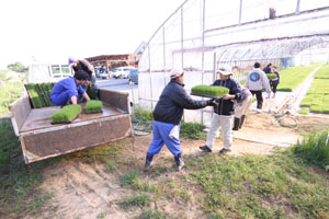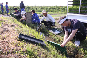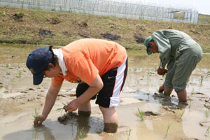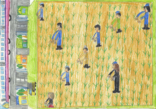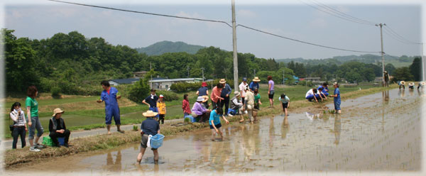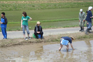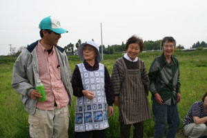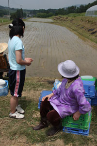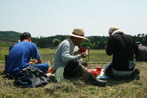 現場に到着したが、田んぼへの道幅が狭く、砂利道で、道の横は農業用水路?で怖かった。やっと現場についておやつタイム。新太さんはまだ機嫌が直らなかったが、せんべいを食べ、ドーナツを食べ、お茶を飲んでいるうちに機嫌はよくなっていた。