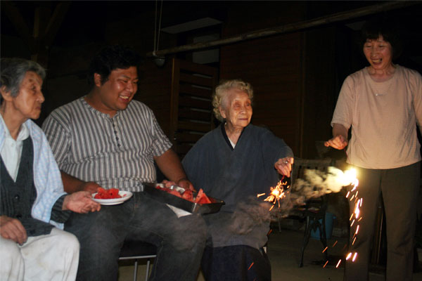 「おら行がね、いがね。花火ばいっつも見でるがらいい〜。おめど行って来!!行がねったら 行がねよ!!」と夕食後さっさと布団に寝てしまったミヤさん(仮名)。今年の花火大会は特養も一緒に行く事になっていて、グループ1はぜひ全員で出かけたいと計画をしていた。