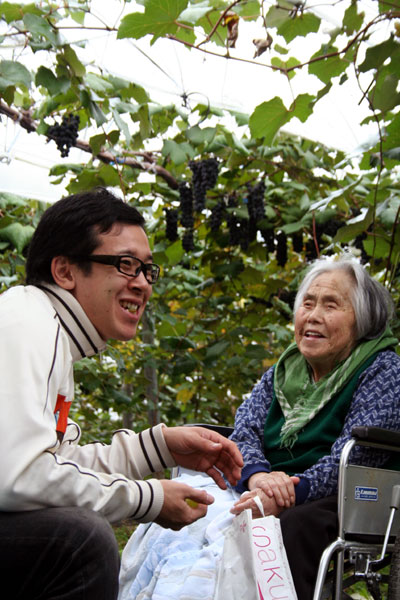 ブドウ狩り おんぶにだっこで 出かければ ほおばる実り 晴々笑顔 あいにくの 雨の中でも 晴々と ブドウ畑で 食らえば食らえ