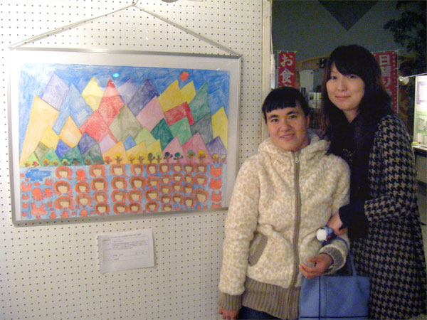 金曜日に絵を描き上げ、週明け月曜日。昌子さんと私のふたりでふれあいランドに絵の搬入に向かう。会場に到着すると自分の作品を大事そうに抱えて受付までいく。初めての場面や人に過度に緊張するのでどうなるか心配していたが、意外や、はにかみながら笑顔で受付で絵を渡した。帰りの車中、絵を書き終えた表情には、自分の手で搬入したという安堵感もみられ、その雰囲気に私も一緒につつまれて幸せな気持ちにさせられた。