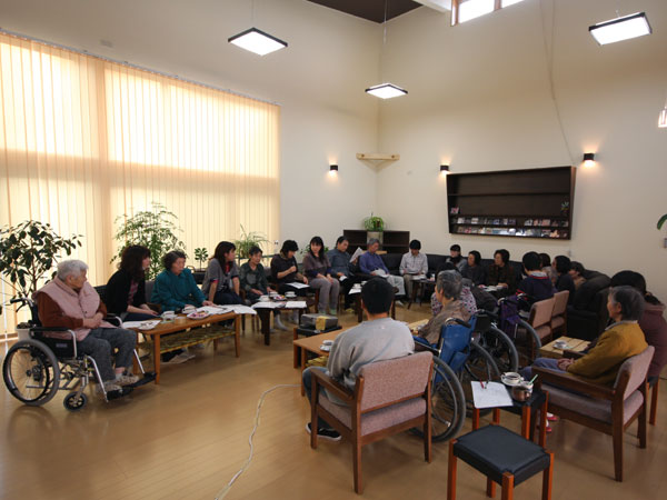地域密着サービス事業所「銀河の里」では、2ヶ月に一度、利用者の家族さん、市役所の方、第三者委員の方、利用者、スタッフが集まって、情報交換や里の様子などを伝え合う会議を開催しています。