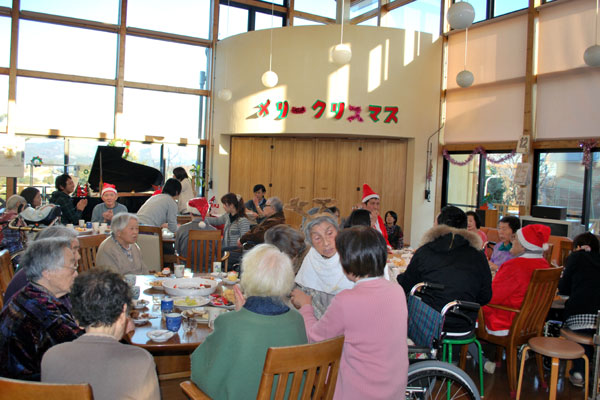 当日、グループホームとデイサービスの利用者さんがホールに集まり、緊張してぎこちない司会でクリスマス会がスタートした。各部署で作ったケーキやクッキーなどの手作りのお菓子がテーブルいっぱいに並んだ。普段は歌や踊りでみんなを盛り上げてくれるサチさん(仮名)が、今日はサンタクロースに扮して乾杯の音頭をとってくれた。サチさんの「かんぱーい!!」で会場は盛り上がっていく。