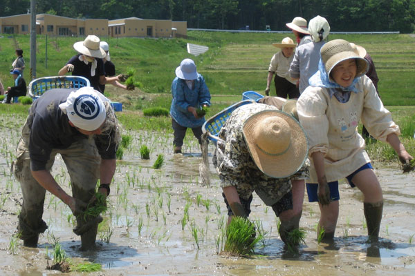 5月最終日、雨続きで寒かった天候がやっと晴れた。延期となっていたもち米の手植えがやっとできた。 昨年は1枚の田んぼの半分を田植機で植えて残りを手植えしたのだが、作業に慣れている畑班の若手メンバーや昔からやってきた田んぼ作業が体に染みついている司さんや運一さん達が一足先に植え始めるとあっという間に進んでしまい、さらに手植えが慣れている高齢者の桃子さん(仮名)やクミさん(仮名)達が後から加わると、みんなが手植えできるスペースがほとんどなくなってしまいそうな勢いのために手を休めざるを得なかった。ただの“イベント”にしてしまうと、正直物足りなく感じた。手植えは職員と利用者が関係をより深める場であり、また新人職員にとって高齢者や他部署のメンバーとの交流の場でもあるはず。どうせなら、少なくとも田んぼのなかに入って作業できる何人かは本気でやったほうが活気に湧いておもしろいんじゃないかと思い、今年は一枚全部を手植えすることにした。