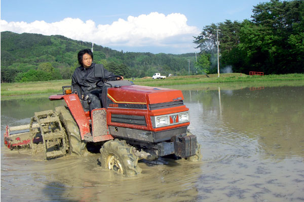 生まれて初めての田起こしに、いくらかワクワクしながらトラクターで田に入ってみたまではよかったが、どう回ったら効率的なのか、掘る深さは適切か、などといった悩みが頭をめぐり、初日は練習で終わってしまった。スタッフ哲哉さんに教えてもらいながら、田起こし週間が始まった。なんとか田起こしが終わり、次は田んぼに水を張ってから行う代掻きの作業が続くのだが、やはり代掻き用のロータリーの取り付けに難儀し、これも自分ではできず業者に取り付けてもらうはめになった。