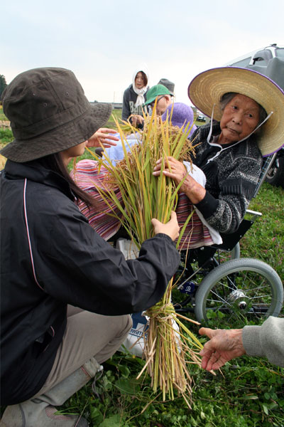 その人と初めて出会ったのは、昨年の秋。里の稲刈りの田んぼにゴトゴトと車いすでやって来て、みんなの作業の様子を、小さい目をまん丸にし、両手を合わせて見つめていた。私が挨拶をすると、「こんな素晴らしいところへ、連れてきていただいて、みなさんのこうして一生懸命働く姿を見させていただいて、どうもありがとうございます…」とずいぶんと丁寧に言われるので、私も面食らいながら「そんなに言ってくれてありがとうございます。」と互いに手を合わせながら拝みあった。
