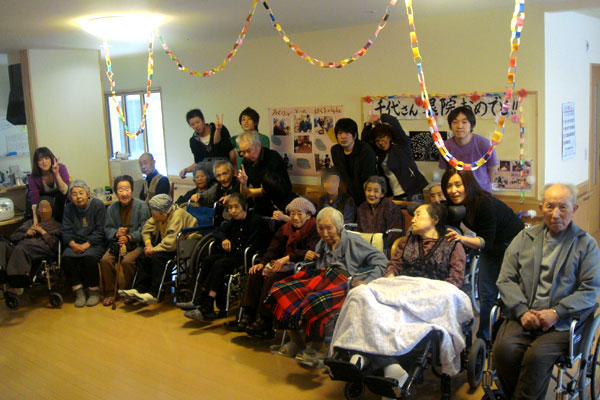 主賓の佳代さんは入浴後、着飾って登場する手はずになっていた。いよいよ、ピアノの演奏とともに佳代さんが登場。「退院おめでとう!」席に着くと、新人スタッフが“ケーキ出していいっすか?!”と目配せをくれる。ケーキが登場すると今度は男性スタッフが、さっと入って佳代さんと一緒にケーキカット。それぞれがはまる場と、それぞれの存在が光る場があった。打ち合わせは無いけど、阿吽の呼吸で、会が進む。佳代さんとスタッフの関係性が、スタッフを主体的に動かして、いい雰囲気で盛り上がった。特養がこんな日々であったらいいと思える時間だった。