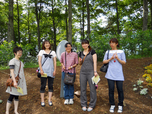 車で1時間半、石神の丘美術館に到着。腹ごしらえをした後に美術館に入場!ところが入口で待ち構えていたのは、プリンに人間の足と手と目がついた、かなりグロテスクな人形。その人形が怖くてなかなか美術館の中に入れない昌子さん。逆に、真央さんは奇妙なその人形に興味津々で、人形と一緒に記念撮影していた。もちろんその人形は入口だけではとどまるわけがなく、展示室にはもっと大きな人形が飾られていた。私たちが作品を見て回っていても、昌子さんはなかなか展示室に入れず遠目で見ていた。でも、三河さんが制作した昔話の「大きなかぶ」をパロった「大きなプリン」という、絵本を見つけてニコニコになり、それで切り替えることができた。