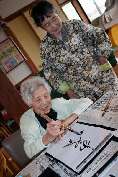 ミキさんには5月にひ孫さんが産まれたので、ひ孫さんの名前を書いてもらいたいと頼むと、スラスラと書いてくれた。その書は、ミキさんが寝泊まりしている和室の壁に飾ってある。その作品が一つあることで、和室の雰囲気がまた違ったものになった。 |