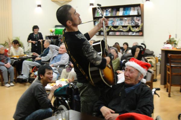 おかげで何とか2曲仕上げ、いよいよ本番のクリスマスの夜がやってきた。三浦さんが正装したバーテンダーになりカクテルを出す。鎌倉欧林洞(おうりんどう)の味を凌駕したと厨房スタッフが豪語する自慢のパウンドケーキと里のリンゴで作ったフルーツなど、里ならではの料理が並ぶ。ライブハウス風の交流ホールは雰囲気バッチリで、集まった満員のお客さんで賑わっていた。ライブを数々こなしてきた酒井さんのギターで、ノリノリの演奏がはじまった。