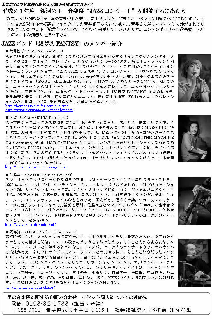 ▼音楽祭に参加した職員のうち、3名が「あまのがわ通信」の記事を書いていただきました▼ 1.中屋なつき「銀河の里音楽祭の特養ミニジャズライブ」 2.板垣由紀子「音楽祭:解きはなされる私」 3.佐藤寛恵「音楽祭ライブ記」